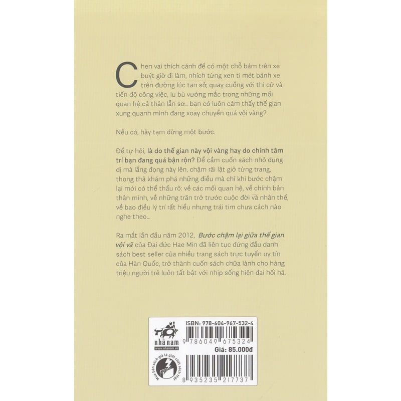 Ra mắt lần đầu năm 2012, Bước chậm lại giữa thế gian vội vã của Đại đức Hae Min đã liên tục đứng đầu danh sách best-seller của nhiều trang sách trực tuyến uy tín của Hàn Quốc, trở thành cuốn sách chữa lành cho hàng triệu người trẻ luôn tất bật với nhịp sống hiện đại hối hả.