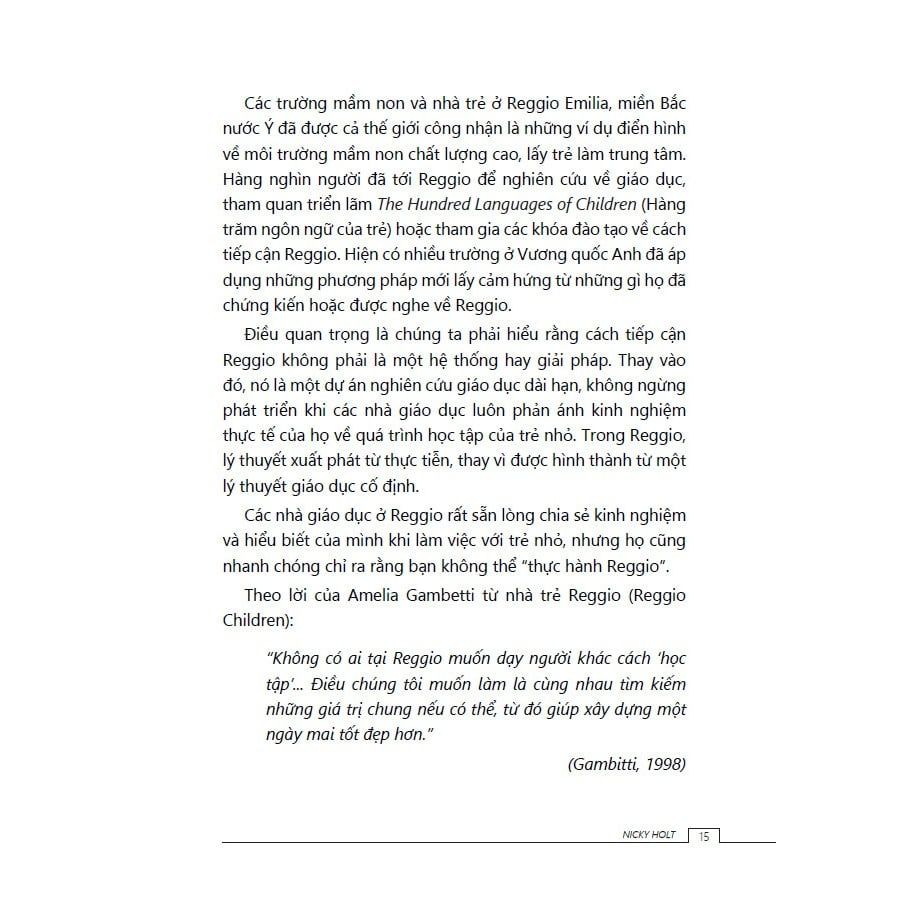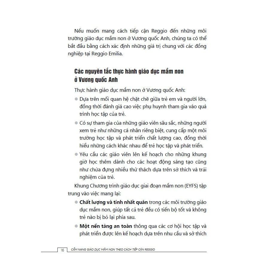 Cuốn sách này sẽ trình bày cách các nhà giáo dục tại Reggio Emilia (một thành phố tại Italy, nơi khởi nguyên của cách tiếp cận Reggio) làm việc với trẻ nhỏ, đồng thời xem xét mối liên hệ giữa cách tiếp cận Reggio và các nguyên tắc cũng như những cam kết của Khung EYFS sửa đổi. Cuốn sách cung cấp những ví dụ thực tế liên quan đến trẻ em ở các độ tuổi khác nhau trong nhiều bối cảnh khác nhau, giúp người đọc thấy được mối liên hệ giữa lý thuyết và thực tiễn.