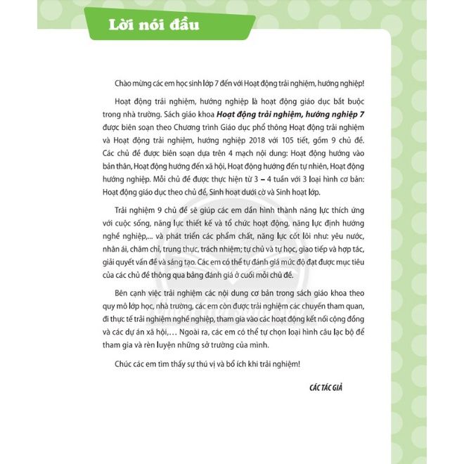 Hoạt động trải nghiệm, hướng nghiệp là hoạt động giáo dục bắt buộc trong nhà trường. Sách giáo khoa Hoạt động trải nghiệm, hướng nghiệp 7 được biên soạn theo Chương trình GDPT 2018 với 105 tiết, gồm 9 chủ đề. Các chủ đề được biên soạn dựa trên 4 mạch nội dung: hoạt động hướng vào bản thân, hoạt động hướng đến xã hội, hoạt động hướng đến tự nhiên, hoạt động hướng nghiệp. Mỗi chủ đề được thực hiện từ 3-4 tuần với 3 loại hình cơ bản: Hoạt động giáo dục theo chủ đề, Sinh hoạt dưới cờ và Sinh hoạt lớp.