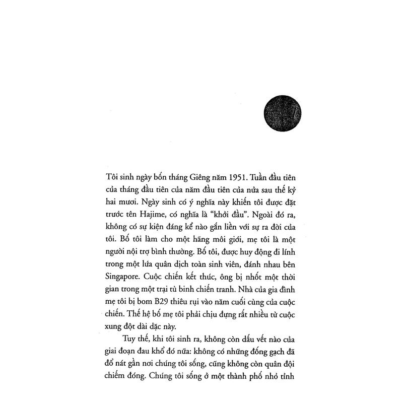 Năm 37 tuổi, Hajime đã có một cơ ngơi đáng để anh mỉm cười hài lòng, một công việc vừa kiếm ra tiền, vừa thỏa mãn sở thích cá nhân, một người vợ xinh đẹp mà anh hết lòng yêu mến, hai đứa con thơ lúc nào cũng quấn quít chân bố. Cũng như nhiều đàn ông khác ở lứa tuổi này, Hajime cũng có tình nhân, nhưng chỉ là thoáng qua mà không đọng lại chút dư vị nào.
