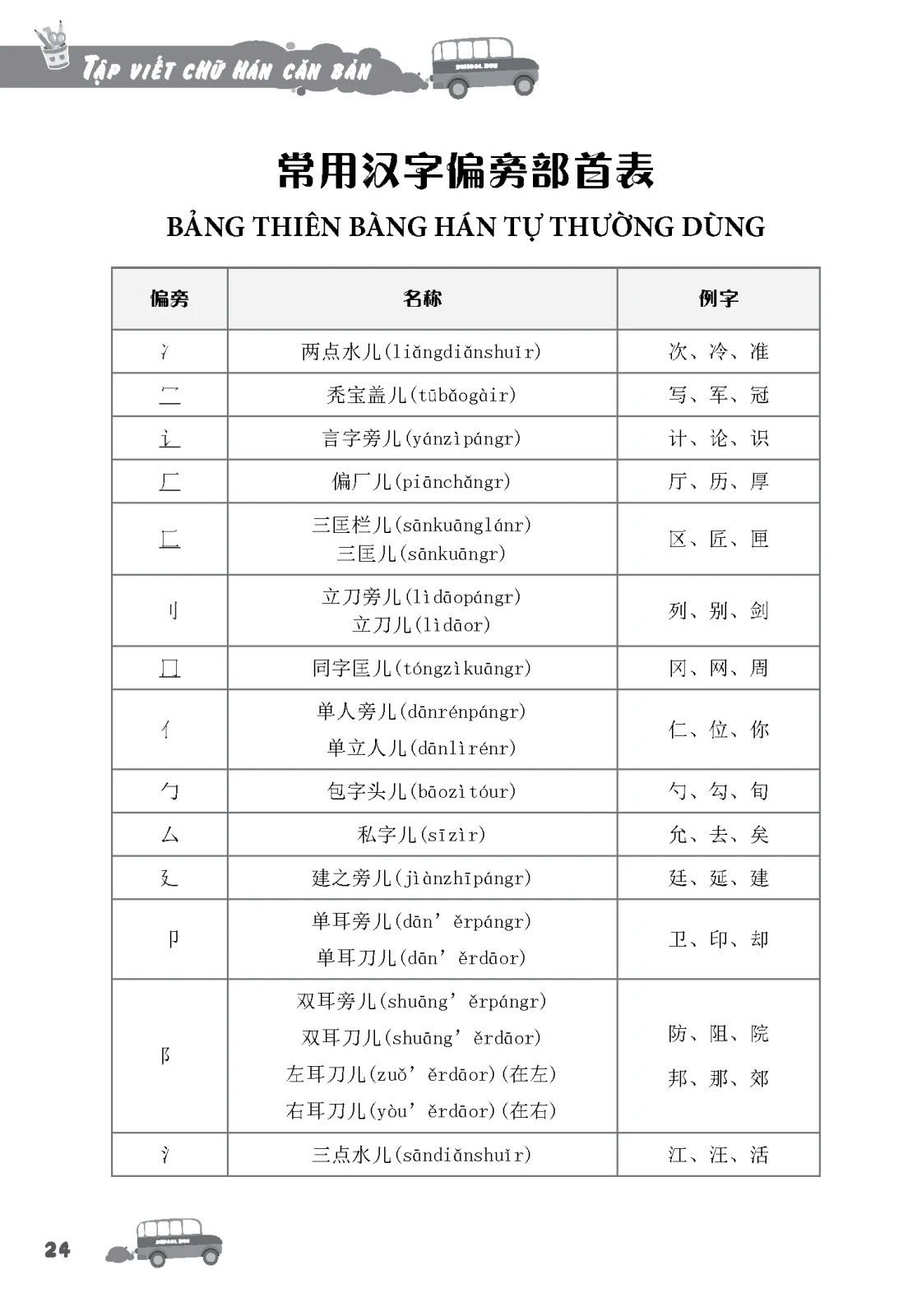 Dựa vào một trong bốn phương pháp trên nên chúng tôi biên soạn cuốn: TẬP VIẾT CHỮ HÁN CĂN BẢN nhằm giúp bạn đọc luyện viết dễ dàng hơn. Cuốn sách gồm 4 phần: