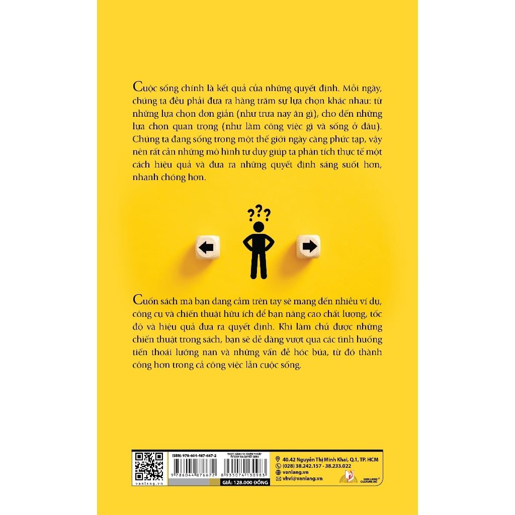 Cuốn sách mà bạn đang cầm trên tay sẽ mang đến nhiều ví dụ, công cụ và chiến thuật hữu ích để bạn nâng cao chất lượng, tốc độ và hiệu quả đưa ra quyết định. Khi làm chủ được những chiến thuật trong sách, bạn sẽ dễ dàng vượt qua các tình huống tiến thoái lưỡng nan và những vấn đề hóc búa, từ đó thành công hơn trong cả công việc lẫn cuộc sống.